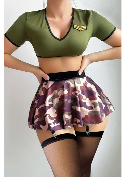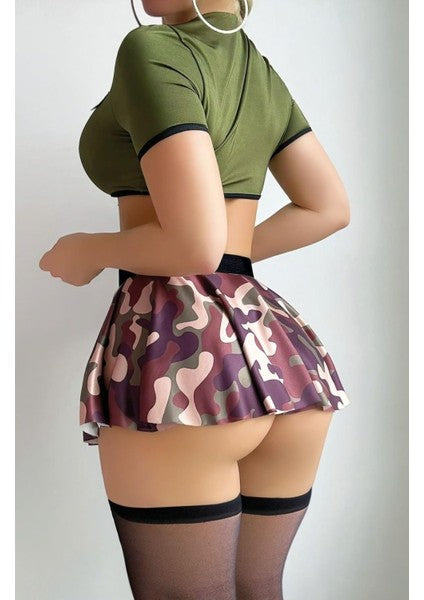 Cesur ve sıra dışı bir tarz arayanlara özel! Kamuflaj desenli eteği, askerî rozet detaylı crop üstü ve bel kemeriyle göz kamaştıran bu kostüm, güç ve cazibeyi aynı anda yansıtıyor. Özel gecelerinizde farklı bir atmosfer yaratmak için ideal bir seçim.