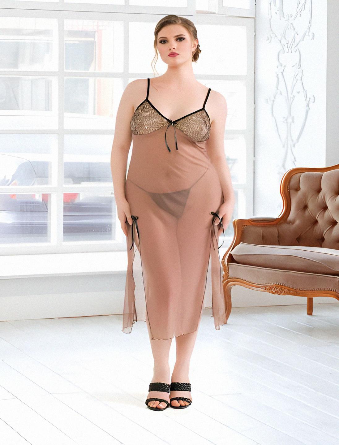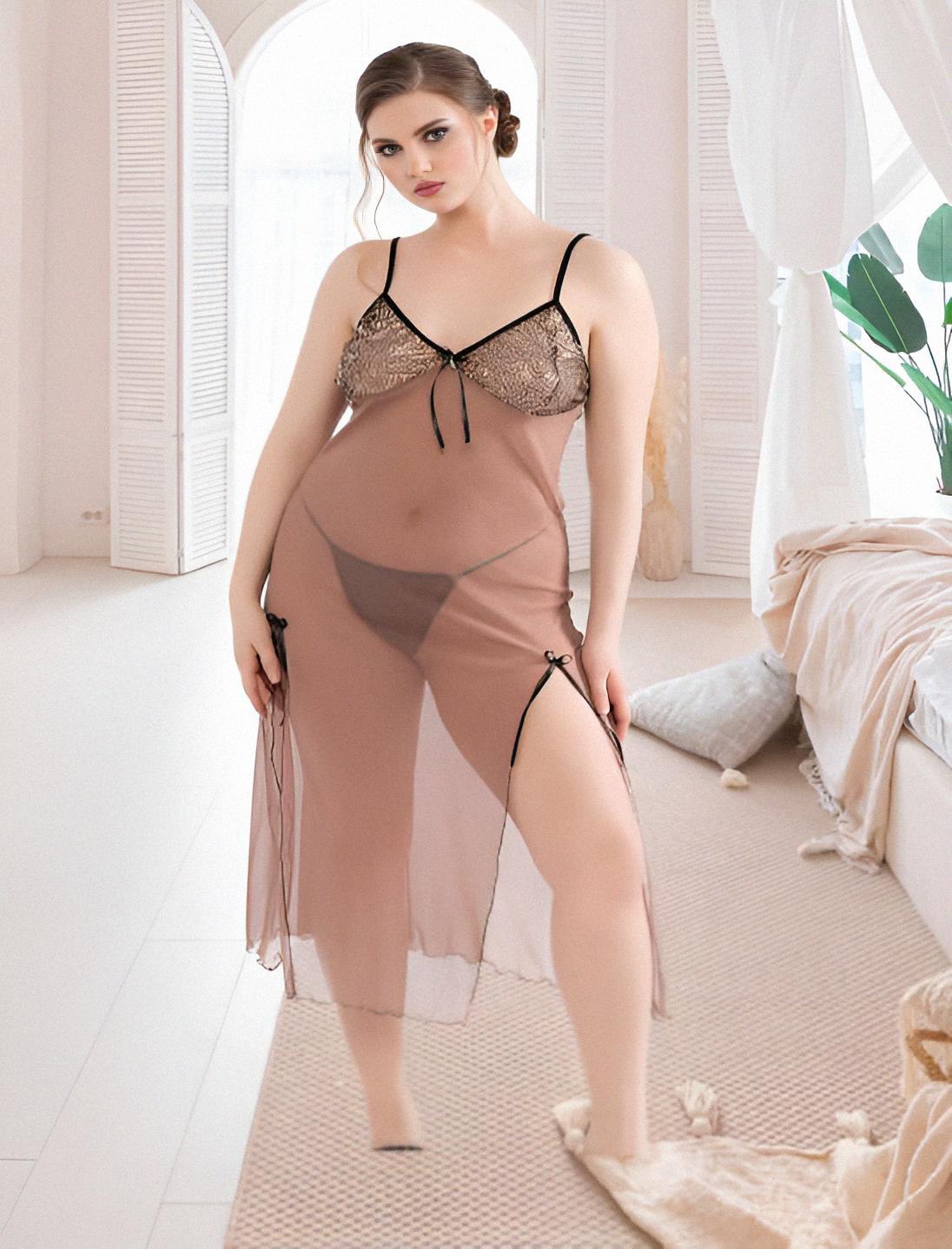 Şıklığı ve zarafeti bir arada sunan bu uzun şeffaf gecelik, dantel üst kısmı ve derin yırtmaç detayıyla feminen bir görünüm kazandırıyor. İnce askıları ve esnek yapısı sayesinde vücudu zarifçe sarar. Transparan dokusu ile özel gecelerde göz kamaştırıcı bir şıklık sağlar.