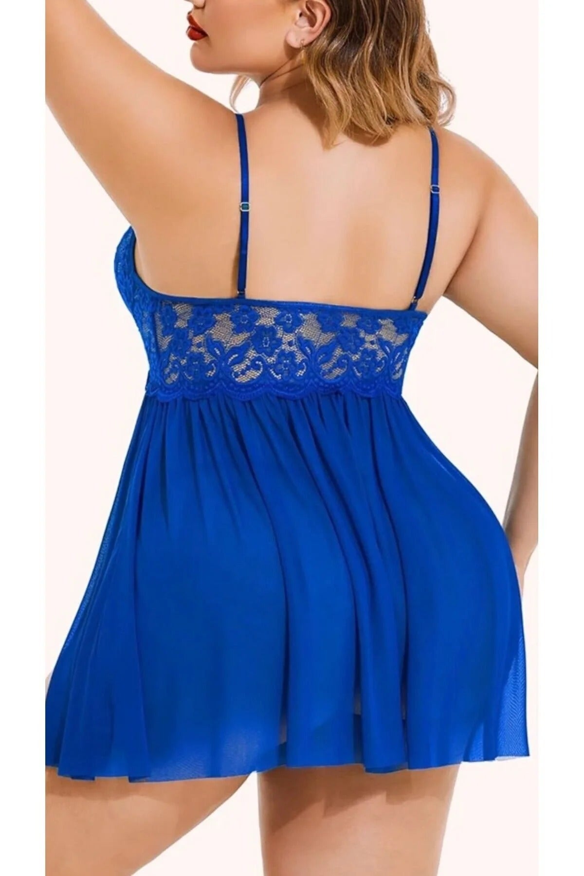 Gösterişli mavi tonu ve dantel işlemeleriyle göz kamaştıran bu büyük beden gecelik, romantik ve şık bir duruş sunuyor. Transparan tül ve göğüs kısmındaki özel detaylarla hem zarif hem de cesur bir görünüm sağlar.