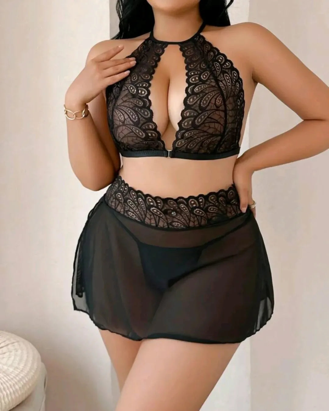 Şıklığı ve zarafeti bir araya getiren bu siyah dantelli takım, özel geceleriniz için kusursuz bir seçim. Göğüs ve bel kısmındaki detaylı dantel işlemeler, transparan tül eteğiyle romantik ve çekici bir görünüm sunar.