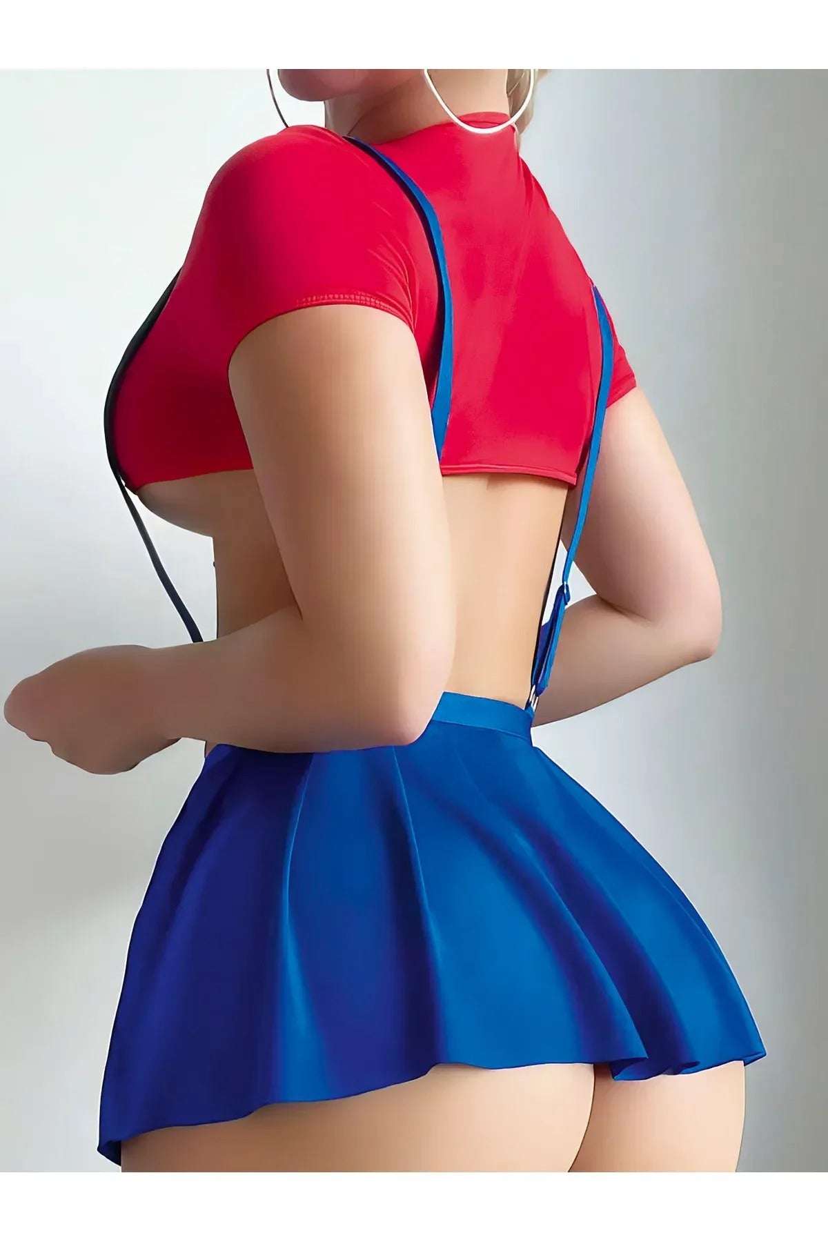 Eğlenceli ve sıra dışı bir tarz arayanlara özel! Mario’dan ilham alınarak tasarlanan bu kırmızı üst ve mavi askılı mini etek kombini, renkli düğme detaylarıyla oyun ruhunu yatak odasına taşıyor. Cesur, eğlenceli ve dikkat çekici bir görünüm sunuyor.