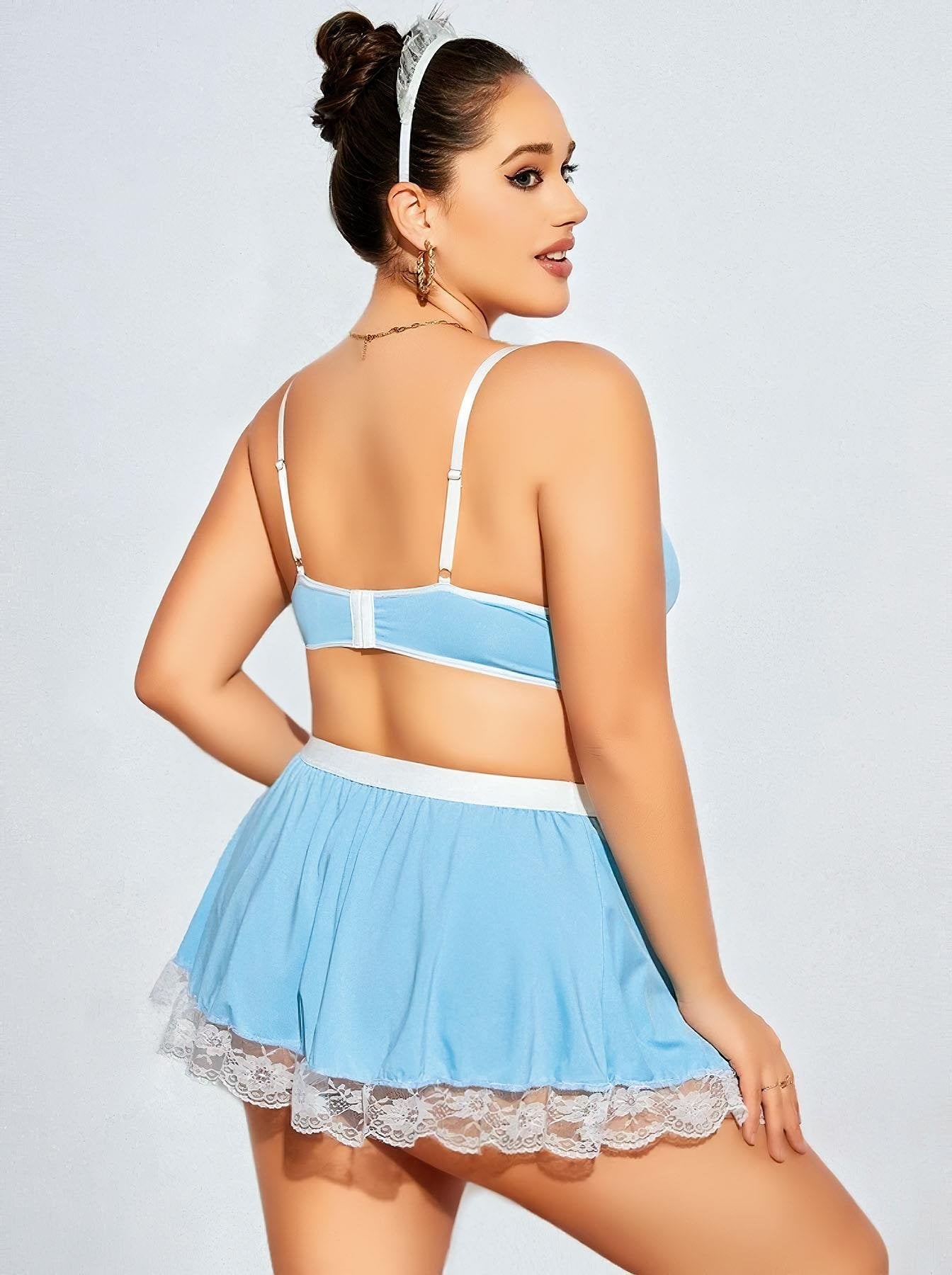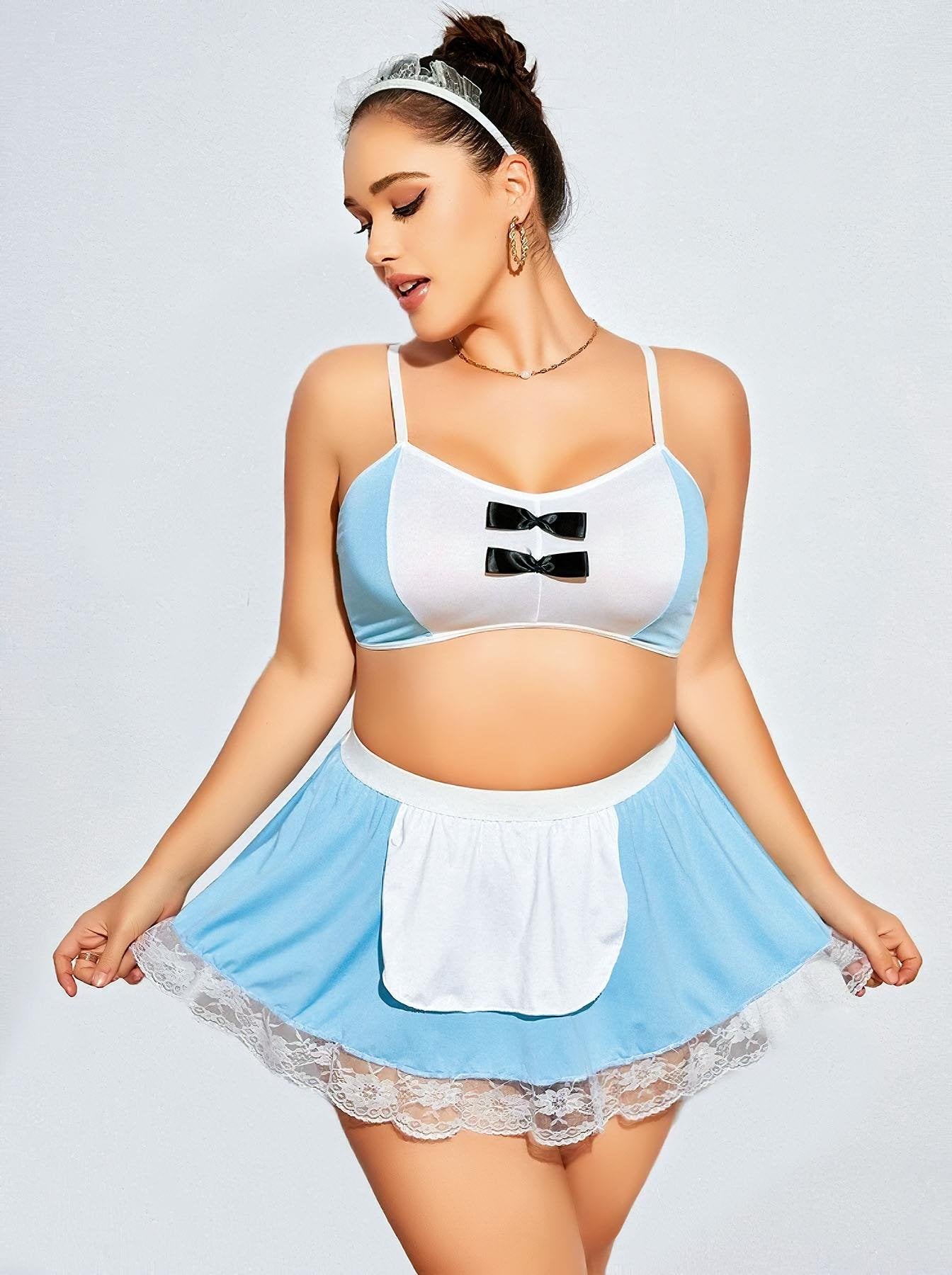 Klasik Fransız hizmetçi tarzına modern bir dokunuş! Mavi-beyaz uyumu, dantel detayları ve mini önlüğüyle bu kostüm özel gecelerin vazgeçilmezi olacak. Büyük beden kalıbıyla hem rahat hem de çekici bir kullanım sunar.