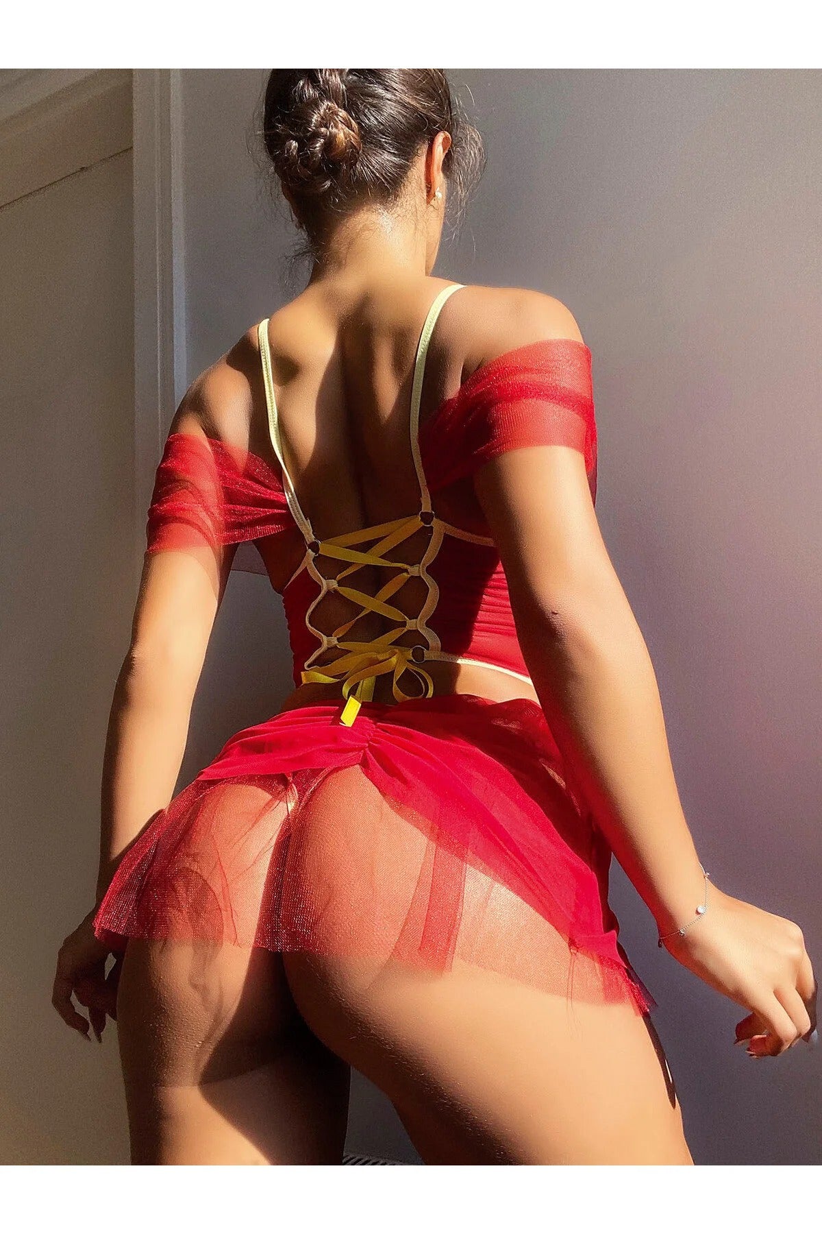 Özel gecelerinize tutku ve şıklık katacak kırmızı tüllü fantazi takım!